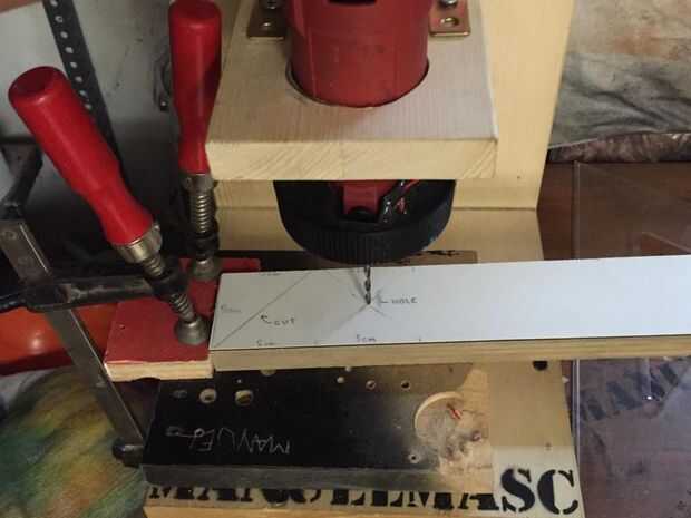 Configurar rápidamente un bloque de tope (foto #2) y utilicé mi taladro casero para hacer el orificio en un listón. Tomé otro, perforé el agujero, y he comprobado si los agujeros se que empareja correctamente (foto #3).