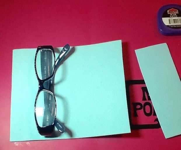 Las medidas exactas depende del tamaño de sus vasos. Empecé con un pedazo de espuma que era 8,5 x 5,5 pulgadas. Mis gafas son de 5,25 pulgadas de largo, así que decidí utilizar el ancho de mi espuma, 5.5 pulgadas, como la longitud para el caso. Luego recorta 2 pulgadas en la longitud de la espuma, dejándome con 6,5 pulgadas para el ancho de mi caso. (Si usted está confundido en este punto, es bueno, así soy yo. Voy a intentar explicar esto mejor más adelante si puedo.)