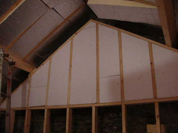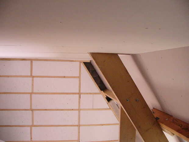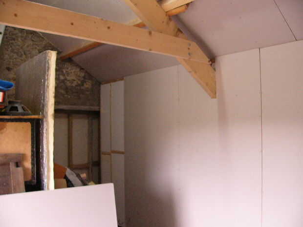 El techo, que está abierto hasta el ápice, es una equilibrada. 70ml de aislamiento entre las vigas del techo y escayola-sobre. He utilizado el tablero con bordes biselados para que no tenga que hojear toda la habitación - sólo hojear las uniones :-)