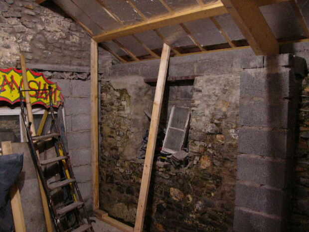 La cuarta pared junto a la casa es de una construcción de piedra desnuda y se está quedando de esa manera. Necesita un poco de trabajo, algunos apuntando y algún disturbio para la estufa de un tronco ardiendo para instalarse.