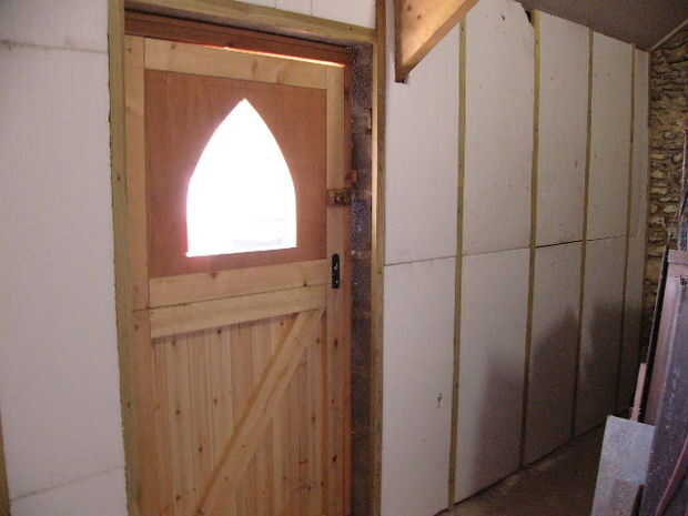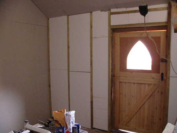 Las paredes. En aras de la pérdida de calor y aislamiento sano, tomé la decisión de perder una pequeña cantidad de área. Así que las tres paredes peninsulares fueron tachonado-hacia fuera con maderas y lleno de tableros de aislamiento. Este método mantiene un espacio de aire en la cavidad de la pared que es ventilado a través del espacio entre las pizarras y las tablas del techo.  En efecto, es una habitación, dentro de una habitación, con ventilación externa entre los dos. Saludable :-)