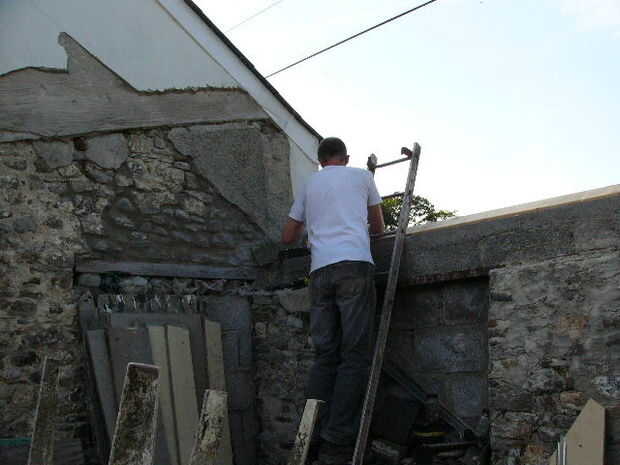La primera parte de esta etapa es montar una placa de pared hasta el borde exterior superior de la frente y paredes traseras, éstos tienen que ser paralelos, de lo contrario, surgirán problemas al cortar las vigas del techo. Una pequeña cantidad de la tolerancia se logra con el voladizo (a nivel del canal). Una consecuencia de no obedecer esta premisa es que la echada de la azotea de modificará sobre su longitud.  La pared frontal, después de quitar los bloques, tenía entoncesa ser cubierto con concreto para ofrecer una plataforma lisa, fuerte y nivelada para la placa de pared para sentarse. Se fijaron las placas de pared con 6" fijaciones propietario marco.