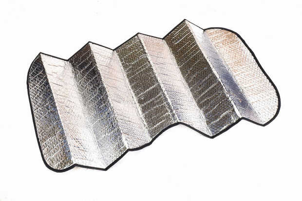 Se trata de un desplegable en el visera de sol hecho de esponja dura y recubierta de una capa reflexiva de plástico plateada. No sólo es barato, pero el nuestro es alrededor de 6 pies de altos por 2 ½ pies de ancho. Esto significa que tomas de cuerpo completo longitud posible.