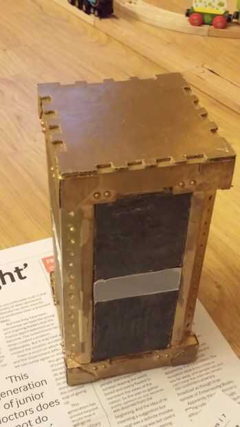 Medido el área entre cada puntal en las cuatro caras del contenedor (como fui mano pegar hay alguna discrepancia entre el ancho de cada cara para medir vale para un ajuste apretado) y cortar 8 paneles de la baldosa de muestra. Pegué en los paneles superior 4 primero para que me permita llegar a la posición de los paneles de acrílico y la parte inferior.