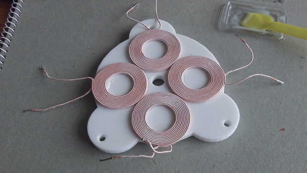 Para construir una bobina de la crepe probablemente utilizará 28 + AWG para esto: cortar una pieza redonda de la tarjeta de 30mm de diámetro (horizontal) con agujero de 10mm en el centro. pegar el alambre como vas y mantenerla con un peso. Personalmente no he hecho esto, pero he comprado bobinas de crepe de ebay (que forman parte de un sistema de carga inalámbrico). Hay videos de Youtube en bobina bobinas de panqueque. Recuerde a invertir cada uno o viento en direcciones opuestas y se conectan en serie.