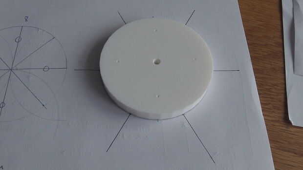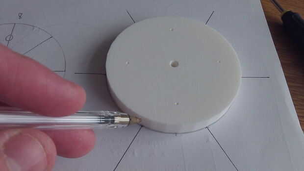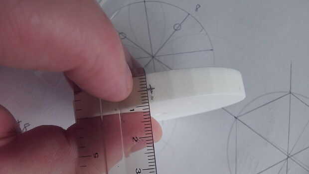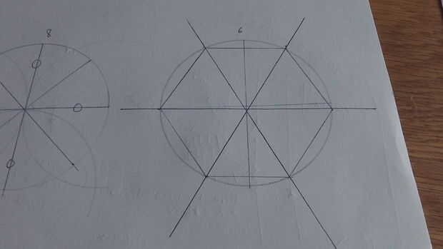 Dibuja un círculo con un diámetro de 75mm brújula (compás ajustado a radio = 37,5 mm), el plano de la cara marca con un lápiz en el borde 6 puntos a 39,27 mm aparte y sacar el hexigram (ver diagrama). Baje esas marcas con una escuadra para marcar el borde cada mm 39,27. Esto le dará 6 líneas en el borde.