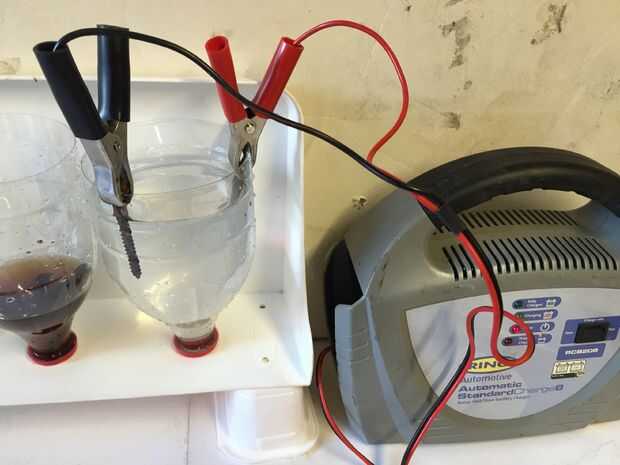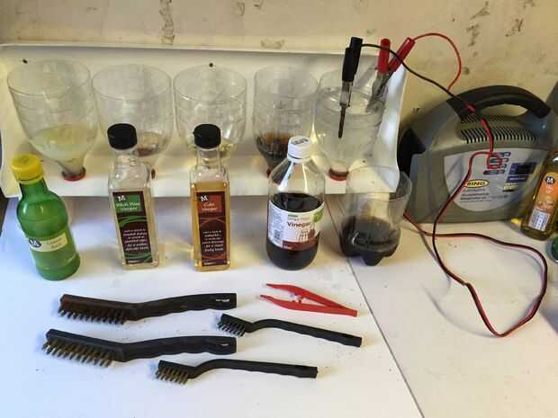 Los contenedores estaban llenos de suficiente cantidad de cada líquido para cubrirlos. El electroysis uno tenía una media cucharada de cristales de Soda mezclado con agua y conectado a un cargador de baterías de 12v. (+ ve al ánodo sacrificatorio y - ve al tornillo oxidado).
