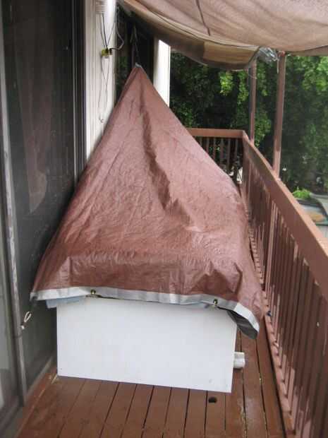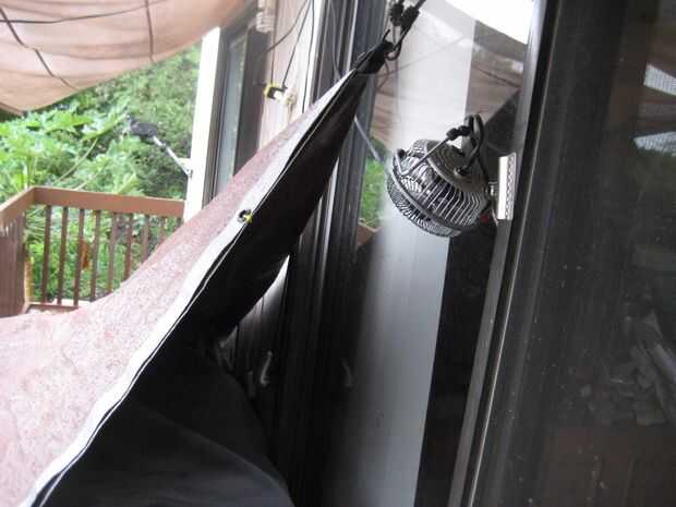 Mientras que la lona hace un espectacular trabajo de mantener la lluvia fuera, también bloquea el viento y que puede ser un poco sofocante bajo la lona. Por lo tanto, tengo un ventilador pequeño atado a la pared que proporciona una circulación adecuada. Ver arriba a la derecha en la última foto de arriba.