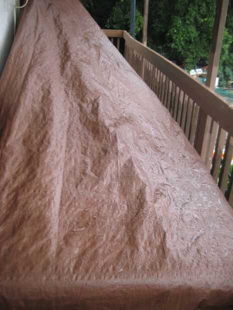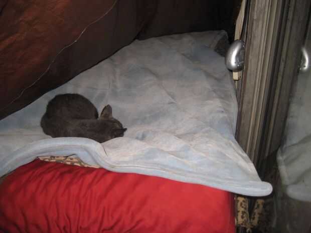 Atar la esquina de la lona a la pared, cabeza de la cama. La lona es realmente suficiente para extender sobre un pie más allá del extremo de la cama que es suficiente para protegerme de la lluvia. Y suena realmente cuando está lloviendo, incluso con tapones para los oídos. Me gusta el sonido mucho mejor que la lluvia sobre un techo de hojalata, que es demasiado ruidoso. Puedes ver que mi gato es muy cómodo dentro de la cama de lona protegida.
