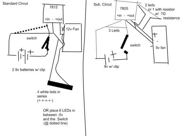 Sólo tienes que seguir el esquema siguiente. Nota: puedes sustituir los 19v en lugar de 2 7805 en lugar de un 7812 y un ventilador de 5v en vez de un ventilador de 12v. O bien puede colocar los leds después el regulador interruptor o tensión. con el - va a la batería.