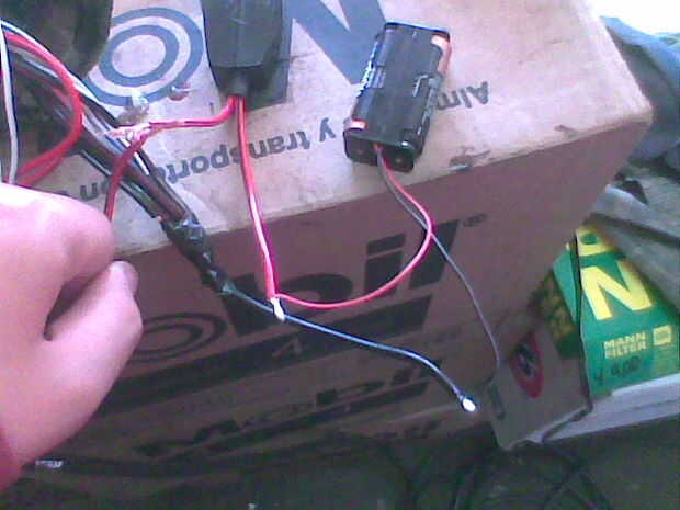 Soldar los cables al soporte de la batería. Ponerse las pilas en el portapilas. Cubrir los cables con cinta aislante.