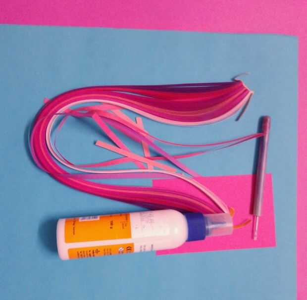 Todo lo que necesita es una hoja teñida de azul de tamaño A3. Rosa hoja teñida de dos contrastantes tonos de color de rosa, pegamento y aguja de quilling.