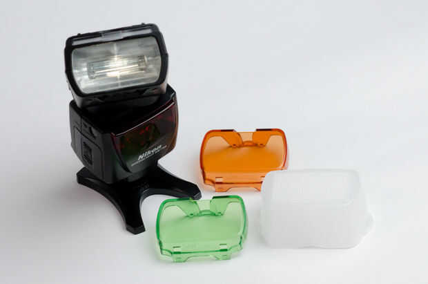 Al disparar con flash con iluminación incandescente el sujeto será a menudo demasiado azul y de fondo demasiado naranja. Un filtro de corrección (gel) hará que la luz del flash caliente para que coincida con la iluminación incandescente. También hay filtros disponibles para que coincida con la iluminación fluorescente (verde) y efectos especiales.