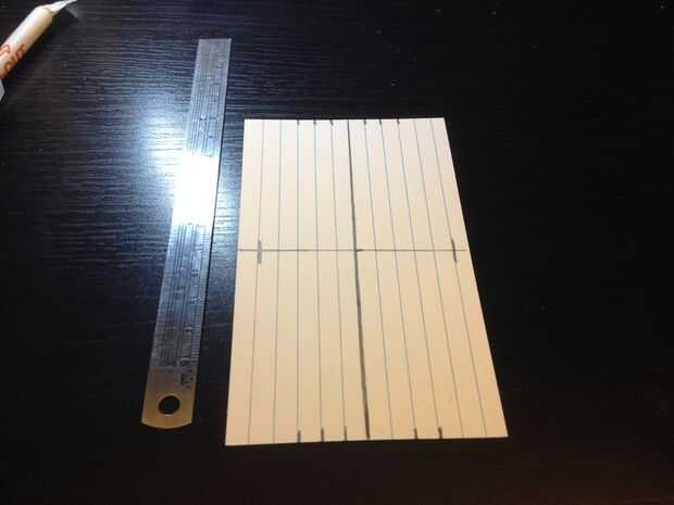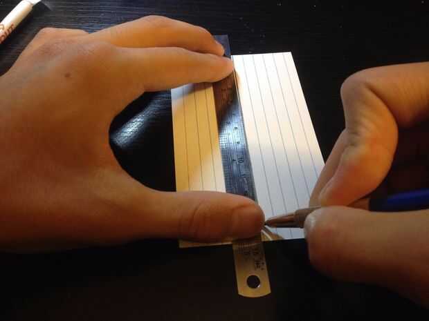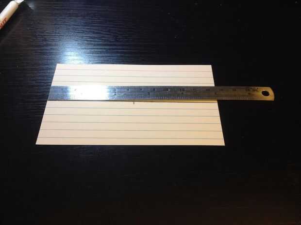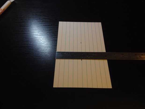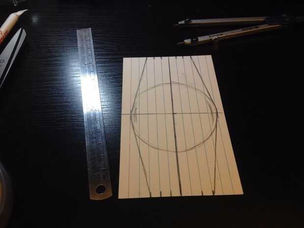La parte posterior fo el plano es un proceso bastante simple, tome una de las fichas y encontrar el centro de, dividirla en 4 secciones y dependiendo de cómo ancho desea que el avión que, marque la longitud de la misma y dibujar un círculo de ese radio. En el ejemplo, no hago el círculo tan grande. Ahora, en los lados de cada papel, dibujar 2 puntos equidistantes en ambos extremos del ala, conecte los extremos opuestos del círculo a los dos puntos. (Mirar fotos para ayuda)