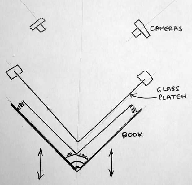 Es el principio básico utilizado para sujetar el libro contra un vidrio (o a veces plástico) cristal de exposición y la foto a través del vidrio, con iluminación desde arriba. Ver el diagrama de arriba. La mayoría de los analizadores construidos hasta la fecha se movió la placa hasta el libro y movió el libro hacia un lado como páginas se dan vuelta a mano. He decidido desarrollar un escáner que mueve el libro hasta el cristal de exposición. Esto ha dado como resultado algunas técnicas novedosas.