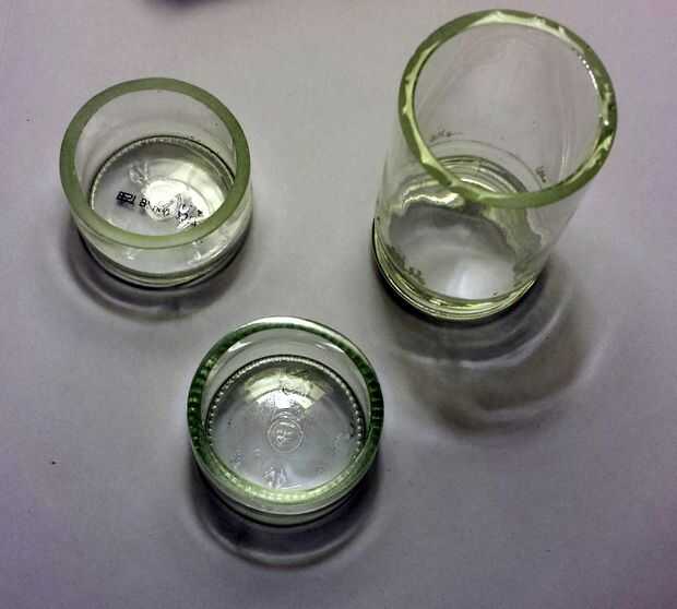 Ahora tenemos todas las piezas. Todos tenemos que hacer es acabar con ellos y montar. En el pasado, he uso lija 120 para la formación inicial, y 220 para crear un mate final para mis vasos. Aunque esto es aceptable desde un punto de vista táctil, simplemente no se ve tan bonito. Procedí con estos de 220 a 600 granos, y como se puede ver, la superficie es lisa y bastante transparente. En la primera foto, usted puede ver el efecto de brevemente de lijado con grano 120 (esquina superior derecha), ampliamente con grano 220 (arriba izquierda) y grano 600 (abajo, centro). Hacer lo mismo con el tarro de la especia y la botella de agua.