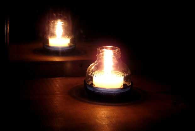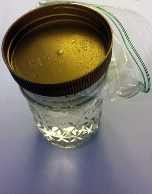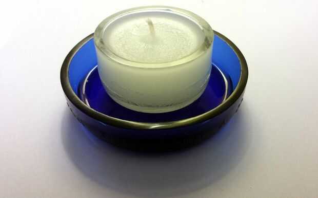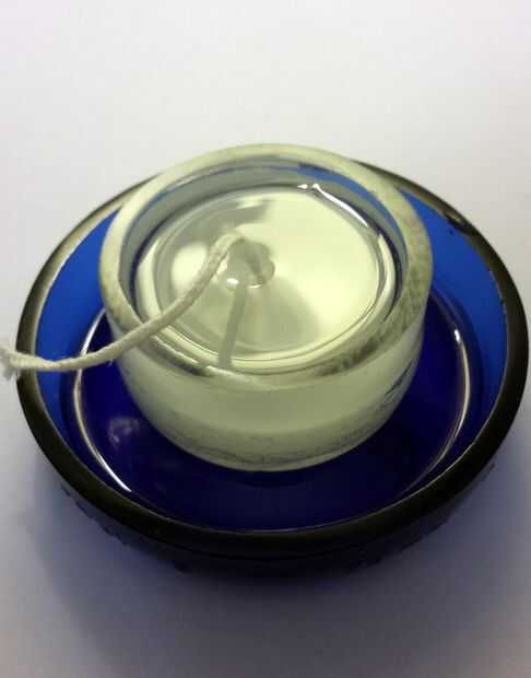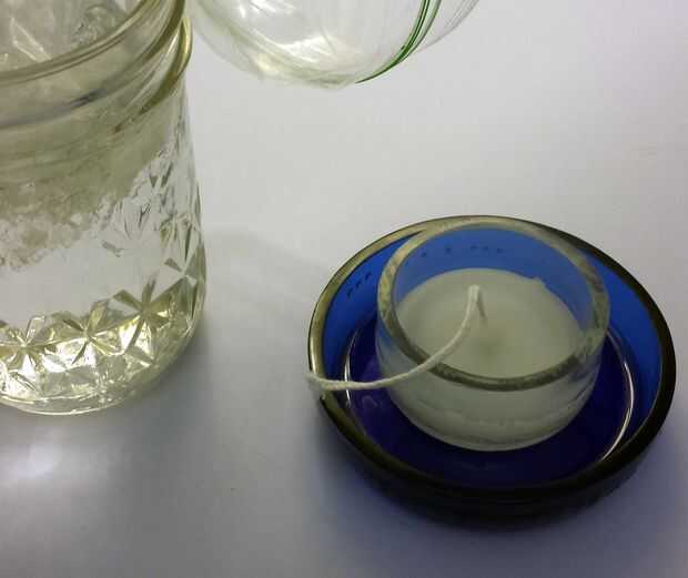Romper un trozo tamaño de vela de cera y cortarlo en trozos más pequeños. Ahora, usando mi método patentado plastic-baggie-in-boiling-water-in-mason-jar, coloque la cera en un plástico holgados, en agua caliente (por lo menos 180 F) en un vaso o taza. Cuando la cera se haya derretido, vierta en el sostenedor de vela (pedazo de tarro de especias). Vierta una pequeña cantidad sobre el peso primero y luego rematar una vez que el primer bit ha empezado a solidificar. Recortar la mecha. ¡ Listo! Ahora la luz en el fuego!