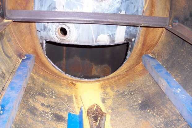 Nota, qué tan cerca tengo la parte inferior de la abertura del corte en la parte inferior del tanque horizontal. Es casi incluso. Bueno, no lo hacen. Hacer al aire libre al menos 1/4 de pulgada por encima del fondo del tanque horizontal o se arrastre el regulador de tiro (puerta).