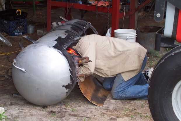 Cortar y doblar las piezas para conformar al interior de las aberturas de la puerta en el tanque. Yo uso varias abrazaderas o vice grips en cada pieza para sujetar en su lugar mientras que soldarlo. Coloque la mitad de la anchura del piso común en el tanque permitiendo que la otra mitad de la anchura traslapar la abertura. Esto será no sólo ayudar a sellar la abertura para evitar demasiado calor o humo de escape sino actuará como un tope de puerta también. Todos los lados de las aberturas de la puerta este de la línea.