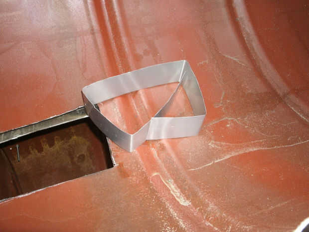 Cortar las esquinas de la intermitente así que usted puede inclinarse en un ángulo de 90o y pegue todo en su lugar con amplias cantidades de sellador de tubería de estufa de temperatura alta. (Imagen 2)