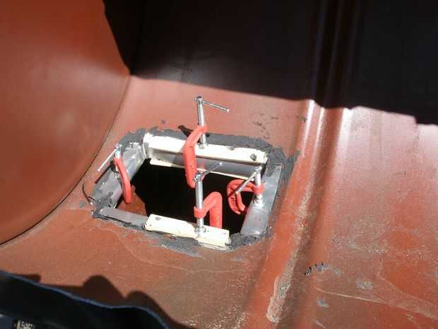 Una vez que el parpadeo se pone en su lugar, y las esquinas doblaron y sellan, utilizar unas abrazaderas y cuñas de madera para todo lo sostenga firmemente en su lugar. (Otra vez, imagen 2) Dejar curar durante por lo menos 48 horas, pero ya es mejor. Recomiendo mantener las abrazaderas en su lugar hasta sólo antes de que usted está listo para su primera quema. Tenga en cuenta que la chimenea llevará la mayor parte del calor de su caja de fuego, para que silicona 500 grados no va a cortar. Necesita 800 grados o calafateo mejor específicamente apto para cocinas o el sello se descomponen con el tiempo. Si yo pude ha encontrado más de 800 grados, lo hubiera utilizado.
