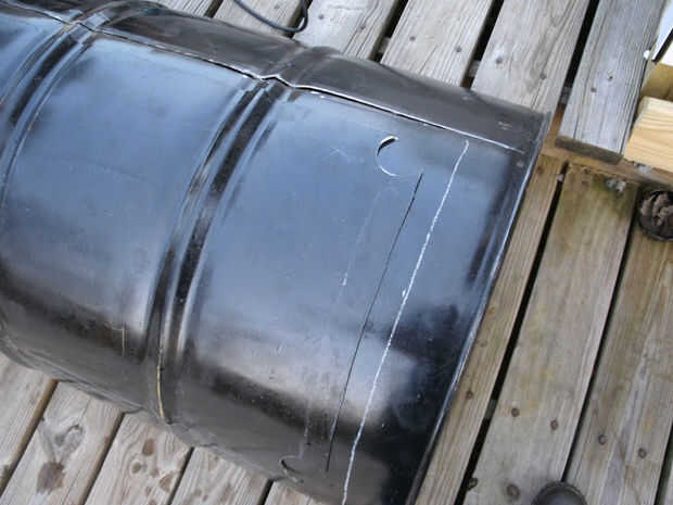Las tapas deben ser bastante sencillas por ahora. Quiero aproximadamente una pulgada más ancha en todos los lados que la apertura, por lo que simplemente colocar la pieza que se cortó hacia fuera hacia abajo como una plantilla en mi barril "chatarra". (Imagen 1) Se puede ver me emocioné y comencé a cortar antes de que mi esposa fue capaz de ajustar una foto.