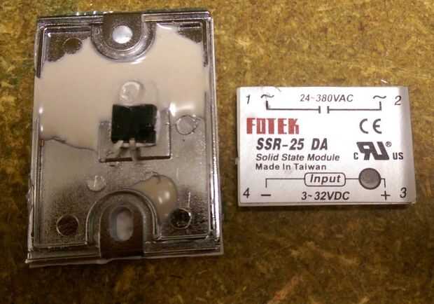 Ante la sospecha de que el SSRs que compré a través de Amazon.com fue el problema, se rompió aparte un 25 Amp nominal parte y 40 amperios nominal parte y lo que encontré me sorprendió. Esperaba basura tanto SSRs fueron construidos muy bien, pero ambos fueron construidos con menor TRIAC. Para referencia, el TRIAC es la parte que realmente cambia corriente y dentro de su SSR.