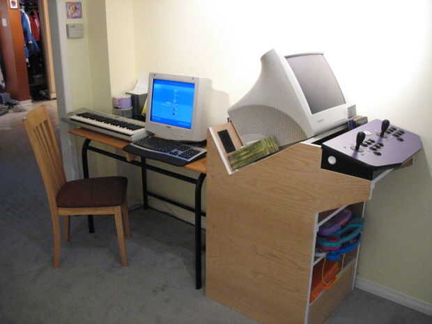 El gabinete de madera se corta de 4 x 8' el panel de emparedado de Home Depot. El Arcade es un Hot Rod SE de http://www.hanaho.com (viene con el MAME y ROMs de Capcom).