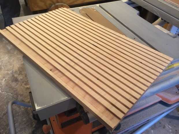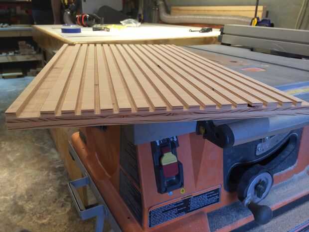 No tengo un disco de moldurar (todavía), por lo que este proceso tomó un tiempo. Corté mi madera contrachapada más larga y más ancha que sea necesario... porque eso es sólo mi método (el método de atornillar para arriba así que déjese algún margen de maniobra). Las mortajas serviría como correderas de 3/16" de madera, por lo que cortan 1/4" ancho... espaciados 3/4" aparte (fondo a fondo). Cada dado tuvo tres pases en un intento de hacer fondos relativamente planos. En cada extremo que hice 3/4 rebajos para aceptar los paneles superior e inferior... y luego cortar el material extra.