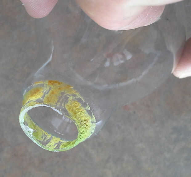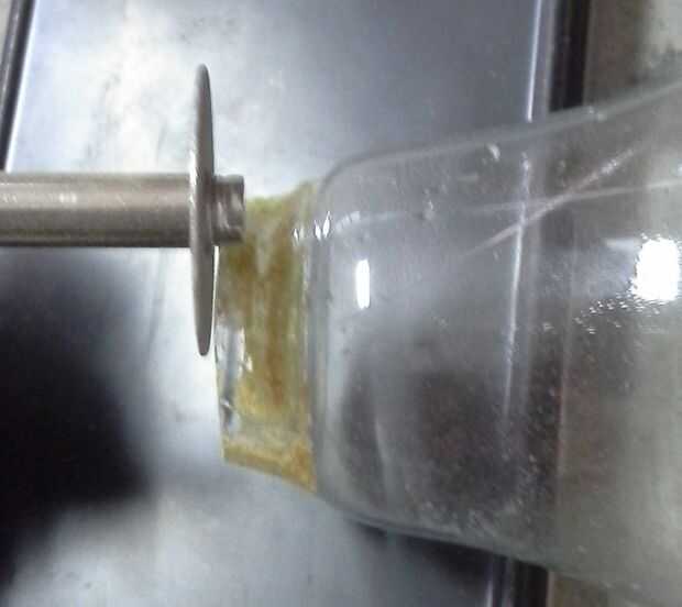 Empiece a cortar alrededor del borde de la lámpara. Desea que la parte superior para salir limpio incluyendo el filamento. (Poner cinta adhesiva alrededor del borde de apoyo adicional porque el vidrio frágil querrán roer de las vibraciones de la Dremel).