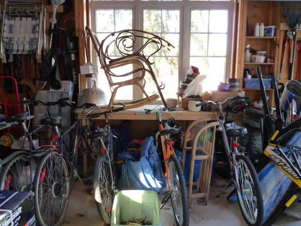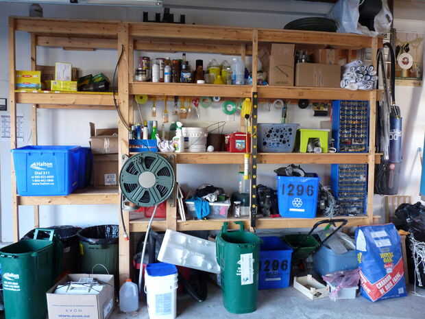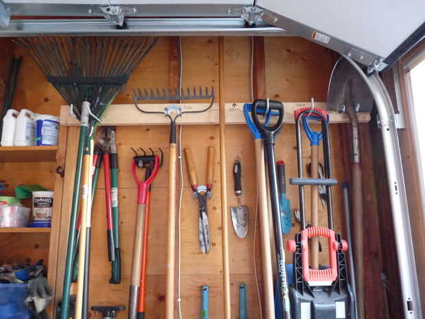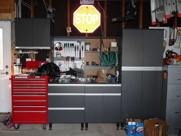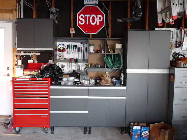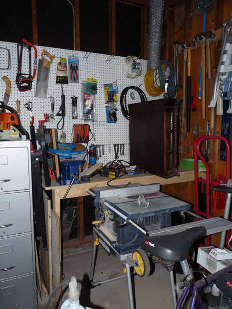 el garaje es un taller funcional y un espacio de almacenamiento. Es un garaje para 2 coches, pero sólo tenemos un coche, dejando el resto del espacio de almacenamiento y espacio de trabajo. Los estantes y los dos bancos están construidos de 2 x 4. Están atornilladas a las paredes, que es especialmente grande para los estantes, porque se pueden subir para alcanzar cosas en la parte superior. El sistema de armario y cajón es storbought y posee todas las herramientas que la caja de herramientas y las paredes no. Las paredes están cubiertas de pegboard en muchos lugares, así que nosotros puede Guarde las herramientas que en ellos. Se detallan los lugares donde pertenecen las herramientas para que nosotros no les pierde. Lo mejor de nuestro garaje es la actic. El todo segundo piso de la cochera es un espacio de almacenamiento. Hay un conjunto de escaleras desplegable para que se pueden acceder a los estantes de arriba, y el resto de las cosas que nos mantienen ahí (como el árbol de Navidad) se establecen en las cerchas. Esperemos que esto le da algunas ideas de lo que puede hacer con su garage! Voto por favor para mí en el compartir su espacio y la primera la hizo foto concursos! ¡ Gracias!