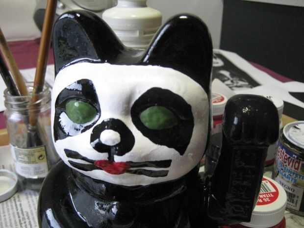 Lo siguiente será pintar los detalles de la cara. Puedes buscar en internet alguna foto del batería de los Kiss. Pero básicamente consiste en pintar los ojos de verde, los labios de rojo y ponerle unos bigotes.