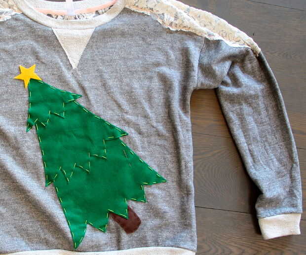 Utiliza seda del bordado para coser todo alrededor de los bordes del árbol y pega la estrella en.