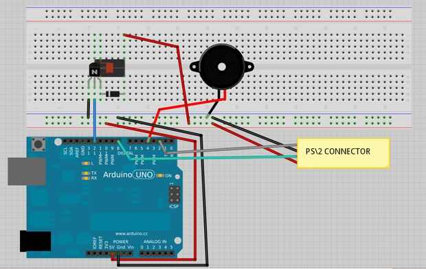 La imagen de proyecto Fritzing abajo puede explicar casi todo, pero lo más difícil es conectar el teclado a la placa Arduino. Hay que conectar el pin de datos del conector PS\2 al Arduino pin 8, pin de reloj a la 2ª, pin de 5V de una fuente de 5V y pin GND a GND. Si encuentras un conector hembra de PS\2 usted es muy afortunado y puede utilizarlo, pero otros pueden hacer como yo: tengo uso como reemplazo de la pieza de metal, cubierta por cinta, de conectores que se utilizan en las placas madre de aislante (cables de: botones de energía y HDD LED, power y reset, conectores USB cara, ecc. ecc.).