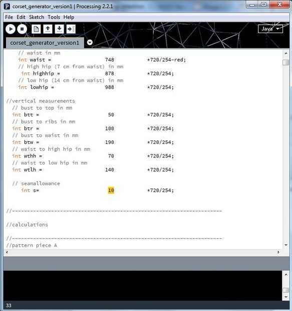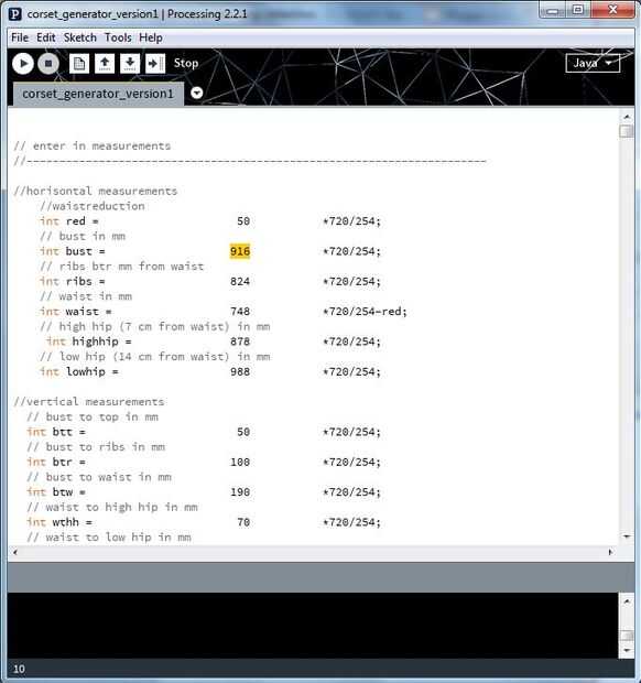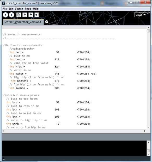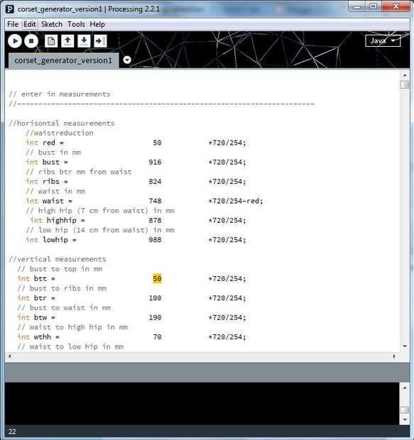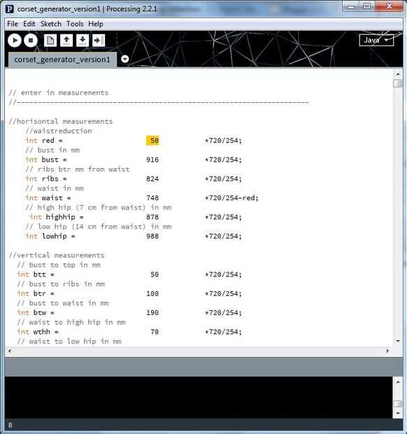 Abra el archivo 'corset_generator_version1.pde' en el proceso y guardar. En la parte superior del archivo, hay una sección marcada 'entrar en medidas'.