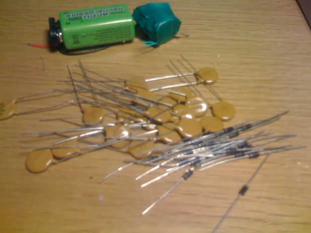 Aquí puede ver los diodos, capacitores, batería de 9V y el transformador de alto voltaje.