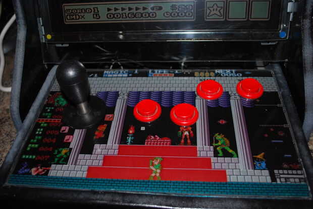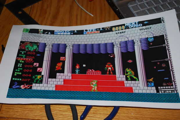 Elija cualquier diseño que usted desea que el panel de control. Decidí hacer un collage de los juegos NES favorito y clásico. Había medido el panel y que el tamaño del lienzo digital era ligeramente más grande que el panel físico. Imprimí una copia áspera y colocarla debajo del panel de plexiglás para marcar los agujeros para los botones y joystick (es más fácil que medir el panel y el cuadro y tratando hasta de esa manera). Una vez que sabía que sería los agujeros he añadido las etiquetas de los botones (B, A, Start y seleccione). Se imprimió una copia final, los agujeros eran marcados y corte.