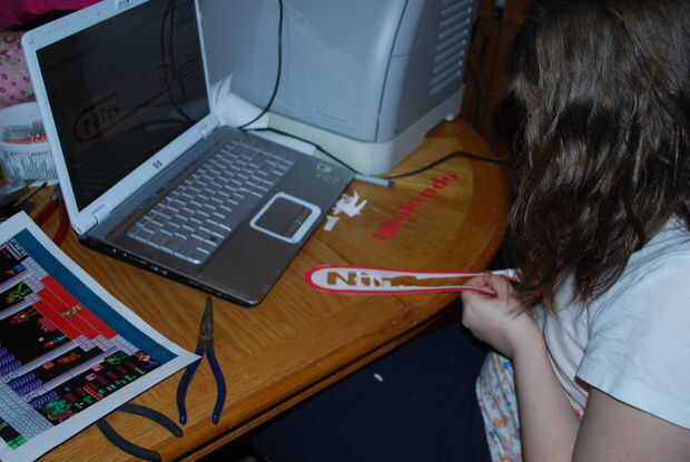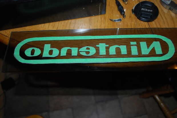 Este siguiente paso habría sido mucho más fácil con un cortador láser. Localicé el logo de Nintendo en línea y saltar para que quepa bien en el plexiglás. Imprimí el logo y corte cuidadosamente cada letra, así como el óvalo exterior. Luego cubrí toda la pieza de plexiglás con cinta de pintor. El logo se centró en el plexiglás * atrás * y luego alrededor de cada letra y el óvalo exterior con un lápiz. Una vez que todo estaba trazado, había quitado las "plantillas" y tomé un cuchillo y corte cuidadosamente el contorno de todo. Retirar lentamente la cinta teniendo cuidado de no sacar las letras o el óvalo exterior con él. Spray pintado el logo entero con unas capas de negro, esperando que se seque, entonces pelado de enmascaramiento de la carta. Ahora con dos capas de rojo todo terminó.