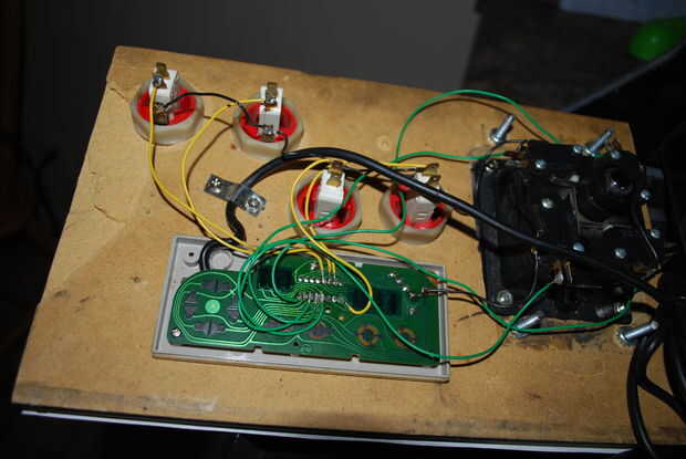 Es importante recordar que no cable para el joystick hasta que haya terminado la obra de arte. Fui por delante y lo hizo de todas formas para ver si funcionaba, pero definitivamente fue un dolor para todo de alambre hacia arriba otra vez. Utilicé tornillos pequeños para montar la parte trasera del viejo controlador NES en la parte posterior del panel de control. Entonces había atornillado el tablero de regulador para con los orificios originales. Trazando los botones me di cuenta de que pin corresponde a cada botón. Todos los argumentos fueron encadenadas juntos entonces conexión a un pin de tierra en el tablero de control. Entonces alambré cada interruptor micro a su pin correcto que eso es todo allí es también él.