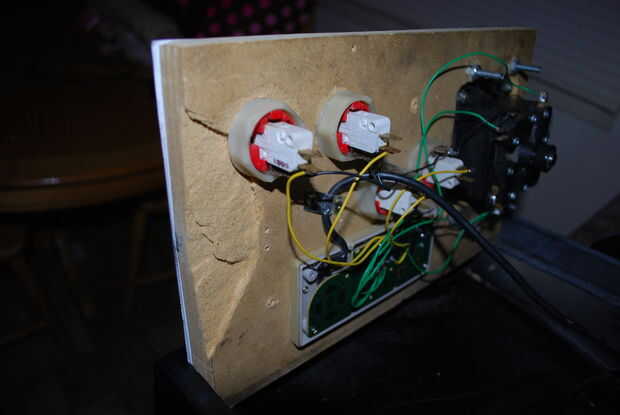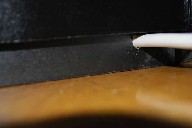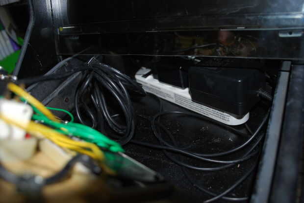 * ADVERTENCIA hice esto, pero no recomiendo it * Para poner el powerbar dentro del gabinete, perforé un agujero ligeramente más grande que el cable de alimentación en la parte posterior de la base. Esto anulará la garantía, y quién sabe si es la causa de un fuego que incendia su casa, que usted no puede obtener seguro. ¿Asustarte todavía? OK siguiendo... Para mantener las cosas como atornillados y limpio como sea posible abrió la powerbar, desoldar los cables, funcionó el cable por el agujero, luego soldar respaldo cerrado * final de la advertencia. La manera más segura para hacer esto, es hacer un agujero lo suficientemente grande para el enchufe ir a través.