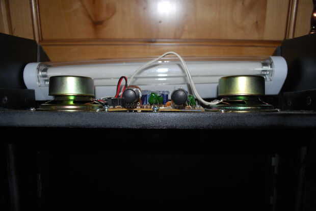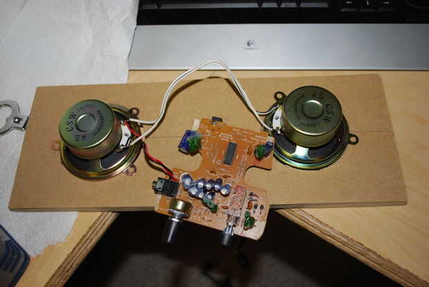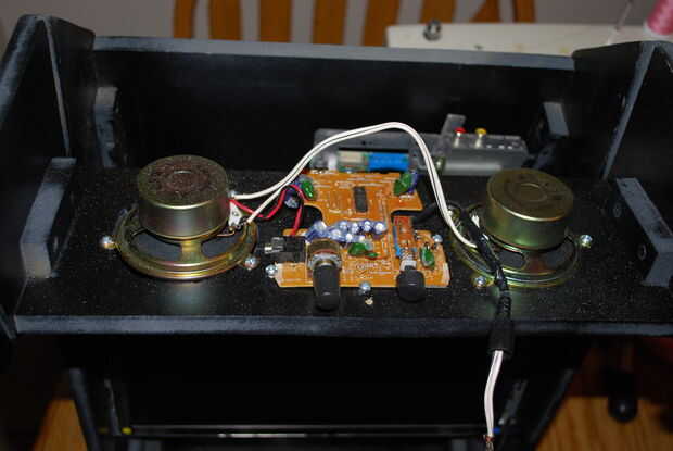 Con mi soldador con un cable de los altavoces estéreos para la salida mono. Luego cortar los cables no utilizados y empalmar un jack macho rca con suficiente longitud para enchufar la salida NES. Los altavoces y el tablero de control fueron montados con tornillos. Originalmente tenía la intención de modificar el sonido de la NES para separar los canales de audio haciendo un tipo de salida estéreo, pero ya que no tengo los componentes para construir en el tiempo este mod fue dejado hacia fuera. Fácilmente aún puedo añadir esto en el futuro.