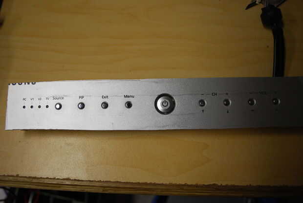 El primer paso fue romper el monitor a solo el marco y la pantalla. Lo hice por dos razones. Uno, mi monitor tenía un montón de plástica voluminoso y construido en altavoces y dos, debe ser tan pequeño como sea posible. Retire todos los tornillos y buscar lengüetas de plástico mantiene al monitor juntos. Desconecté el receptor IR en mi monitor y el poder y el panel de ajustes. Antes de hacer esto configure su monitor hasta tus preferencias preferidos. Si tienes suerte como estaba, sin este panel conectado, tan pronto como se conecta el monitor se enciende (y recuerda las configuraciones anteriores). Utilicé mi herramienta dremel para cortar el panel de control para que si alguna vez necesito cambiar una configuración puedo sólo volver a Fíjelo temporalmente.