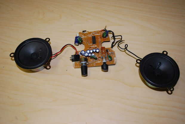 I utiliza un viejo par de bocinas de computadora, tomó em aparte, cortar los cables del exceso. Los altavoces ellos mismos son 3" de diámetro. Bastante directo