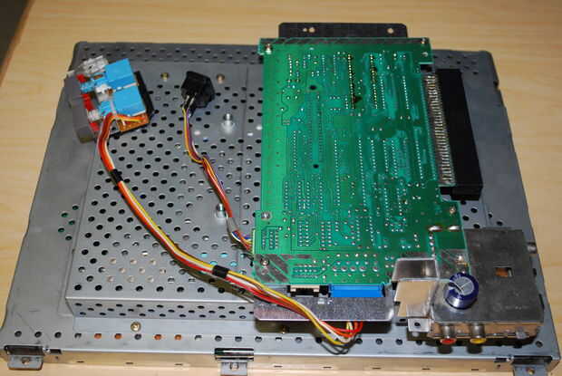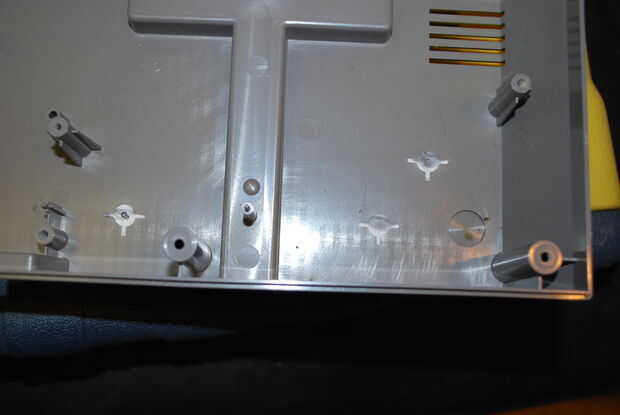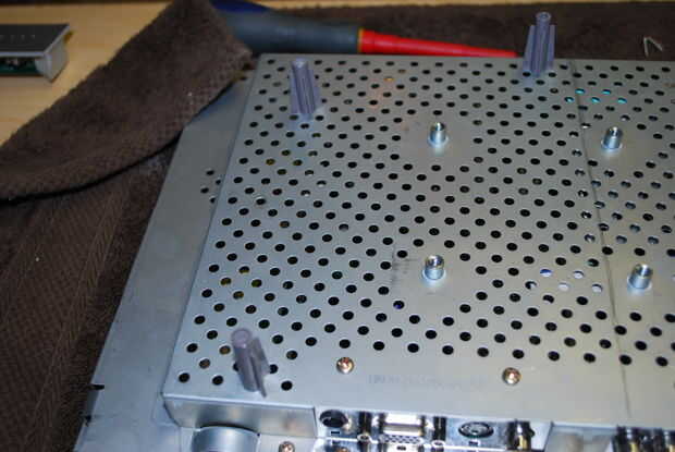 La parte posterior de mi pantalla LCD tiene un escudo de metal con agujeros en ella. Después de mirar fijamente en estos componentes durante un tiempo me golpearon con una idea. Agarré mi motherboard NES y ponerlo encima de la pantalla LCD. Fue de suerte y fue capaz de alinear 3 agujeros alinean con los orificios de la Motherboard, Tarjeta madre NES. Yo utilizando mis pinzas, desprendió los soportes de plástico de la caja original de NES. Luego usé mi dremel para acortar un poco. Puesto que la pantalla LCD era desmontable, Tomé y había conectado a los postes de soporte desde abajo con algunos tornillos sobrantes de desmontaje. El siguiente paso es modificar el blindaje de la NES. Ya que el conector ahora sale recto en vez de en forma de U como el original tuvo que ser modificado. Con un par de tijeras el pedazo que fue quitado. Agarré unos pequeños tornillos y tuercas de mi papelera de repuesto y conectar el blindaje de la NES en los orificios no utilizados. Luego colocar la pantalla de LCD y había montado en la motherboard en la parte posterior.