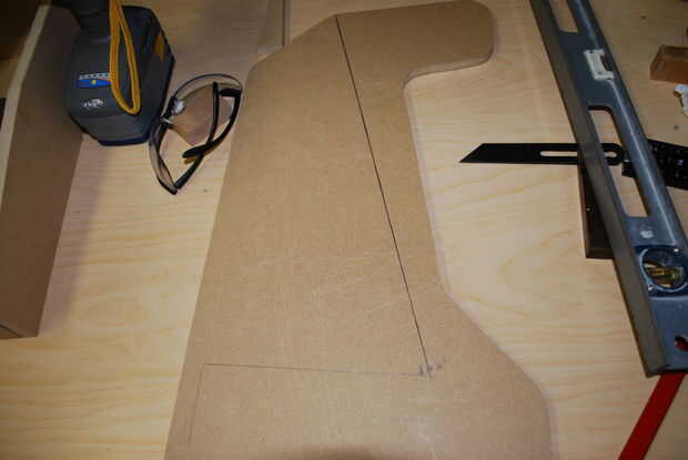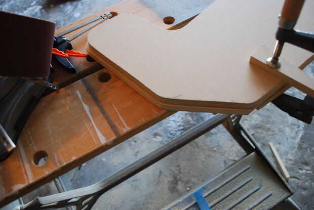 Después de dibujar las plantillas en cartulina me recorto y les trazó dos veces sobre el MDF. Utilizando una sierra de calar corte una parte principal, y las dos partes controlador más pequeños. El último lado necesita dejar deliberadamente un poco de madera extra más allá de las líneas (voy a explicar por qué en el párrafo siguiente). Ahora usar tu archivo y bloque de lijado para limpiar la pieza de "buena" donde siguieron la línea tan cerca como sea posible.