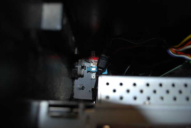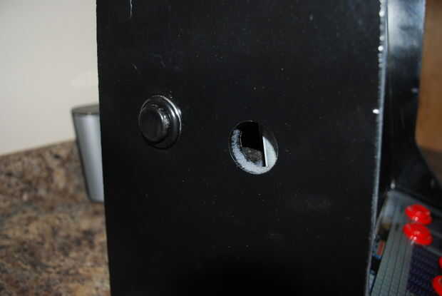 Ahora perforé dos agujeros, uno para el botón de encendido y otro para el botón Reset. Entonces, hice una repisa pequeña para montar el interruptor NES. Colocando correctamente el botón arcade empuja el botón de encendido en perfectamente. Era muy tarde cuando lo hice, y como veis he hecho un poco de un error. Para montar al monitor debo han movido el botón de reset sobre a la izquierda. También, tuve la muesca mi pequeña mesa y rebanada apagado el Reset mitad del interruptor para todo. Afortunadamente, una vez que llego a mi lado-arte este error desaparecerá y nadie sabrá nunca!