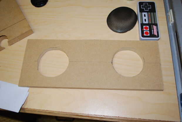 A continuación remonta dos 3" agujeros para los altavoces. Luego utilizando primero una broca para hacer un agujero de arranque agarré el rompecabezas confiable y cortar los círculos. Si tuviera el tiempo habría hecho una plantilla de círculo para mi router, pero todavía tenía resultados bastante decentes con la sierra caladora.