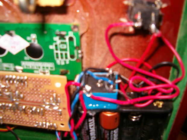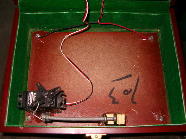 Si no lo has hecho ya, ahora es un buen momento para añadir cuatro patas metálicas a la caja. Usé algunos tornillos que estaban alrededor de mi sótano. Puede utilizar dos de estas para los cables secretos, pero la parte de atrás dos eran más cercanos al circuito así que opté por aquellos. Simplemente soldar un cable a cada tornillo. Asignar uno rojo y otro negro para que sepas qué va dónde. Tomar el cable rojo y soldar al pin de relé que lleva 5 voltios desde el relé al arduino. Tomar el cable negro y soldadura para la conexión a tierra en el relé. Cubrir los tornillos de pegamento caliente y han hecho su circuito de la puerta de atrás! Se puede probar mediante la aplicación de 4 pilas AA para el tornillo en la parte inferior de la caja. Asegúrese de que usted recuerde que es de tierra y que es poder! Si se está conectado correctamente el circuito debe encender y permanecer después se mostrará el mensaje "alimentación hacia abajo"