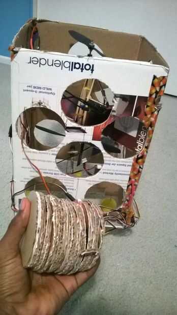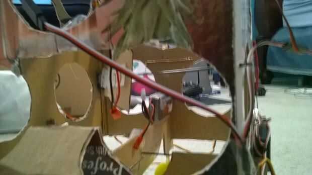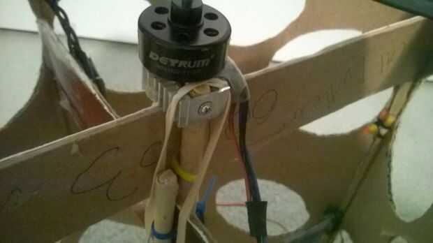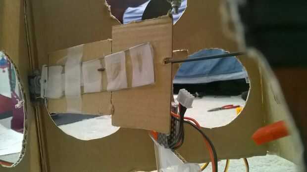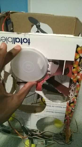 El avance es que no hay armas necesarias para contrarrestar el par motor. Esto es porque las hélices son rompedoras así anulados los efectos de torsión. Hay una superficie de control para el control de guiñada que está regulado por el giroscopio. Con el cuadro de VTOL, es necesario hacer agujeros en la caja para reducir el peso. Usé la boca de un vaso como una plantilla para recortar los círculos de 3,5 pulgadas de diámetro con un cuchillo del exacto. La caja es de 9 pulgadas por 9 pulgadas por 14 pulgadas. Las superficies de control del rodillo y la echada son cerca de 1 pulgada de ancho y 7 pulgadas de largo. La superficie de control de desvío es 2-3 pulgadas de ancho y 5 pulgadas de largo. Una varilla de fibra de carbono se utiliza para fortalecer la pieza de cartón directamente sobre la superficie de control de pitch. Otra varilla de fibra de carbono que nos usa para fijar la superficie de control de guiñada. Es fundamental que el montaje del motor es seguro. I utilizar abrazaderas de plástico, tiene pegamento, un pasador de madera, un tornillo y bandas de goma. Estoy seguro que existen alternativas más seguras. Por favor comentar sobre esas alternativas.