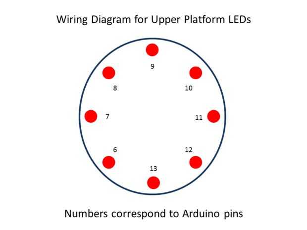 4. Fije los cables azules de los LEDs a los pines de Arduino 6 a 13 por insertar en el protector del tornillo y apriete de los tornillos. El orden es importante o los LEDs no encenderán en secuencia.  Se debe adjuntar como se muestra en el diagrama.  No importa que un LED se inicia con PIN 6: lo que importa es que se unen en una secuencia consecutiva (6, 7, 8,...) no un orden aleatorio.